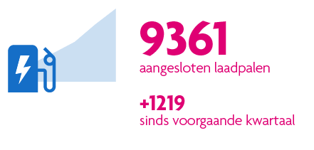 Volgens het klimaatakkoord mogen er vanaf 2030 alleen nog uitstootvrij auto’s worden verkocht. Een groot gedeelte hiervan zal elektrisch zijn. U ziet hier hoeveel aansluitingen voor laadpalen in totaal gerealiseerd zijn in ons verzorgingsgebied en hoeveel dit is toegenomen in het afgelopen kwartaal.