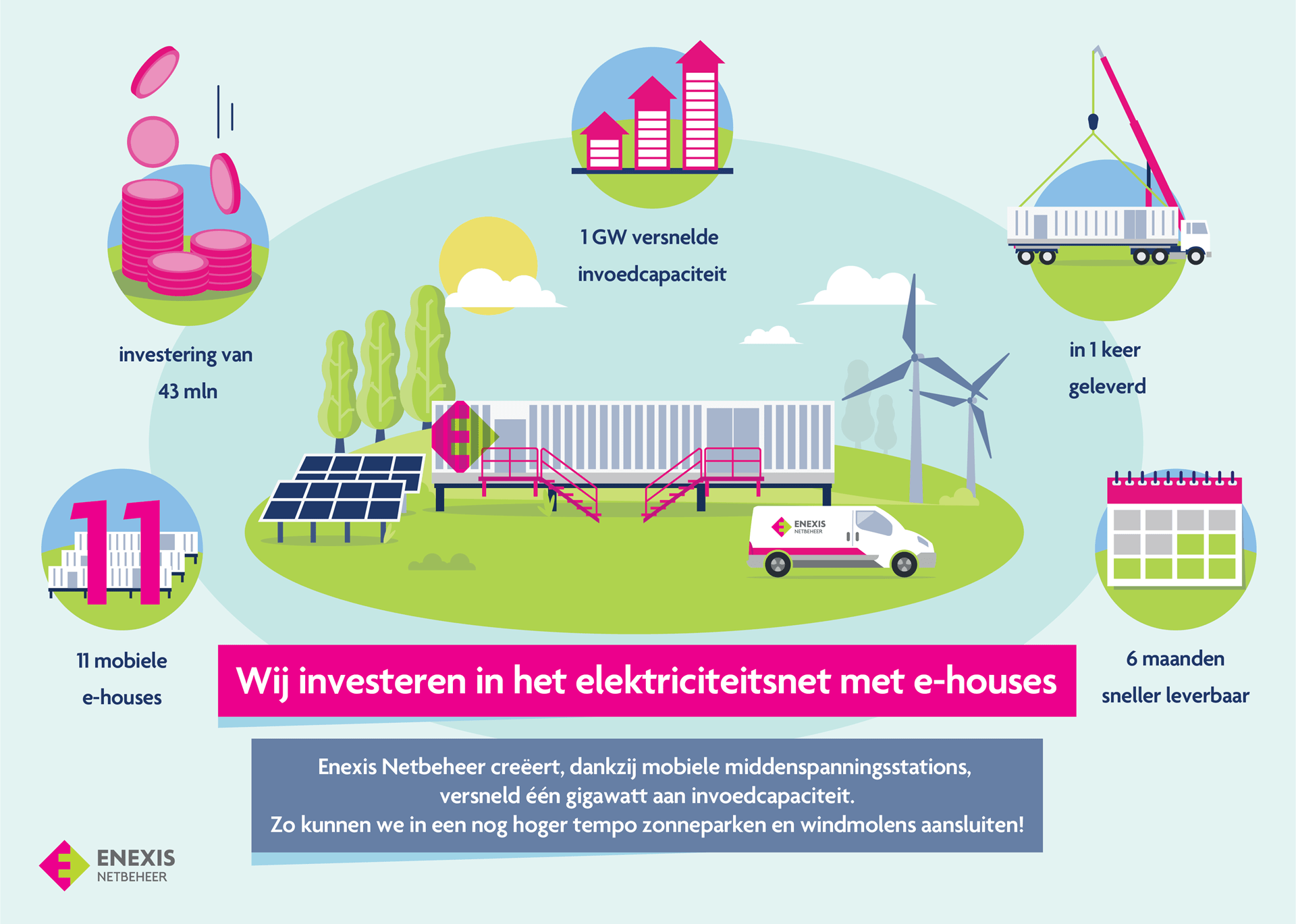 Enexis Netbeheer schaft elf ‘e-houses’, mobiele middenspanningsstations, aan waarmee we onze netcapaciteit versneld uit kunnen breiden. Hierdoor komt er ongeveer één gigawatt (GW) extra opgesteld vermogen bij. Dat is genoeg om zo’n 250 windmolens of 10 vierkante kilometer zonnepanelen op aan te sluiten.