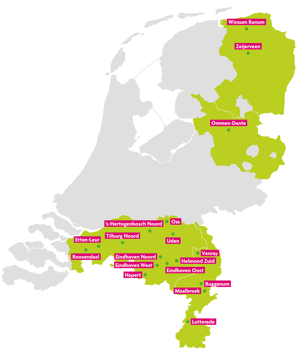 - Bekijk de kaart in pdf. U ziet per gebied welke (delen van) gemeenten eronder vallen.