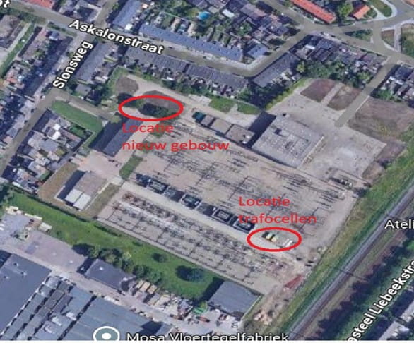 - Middenspanningsgebouw: (Rood vlak vorige pagina) Eén nieuw gebouw aan de noordwestzijde verdeelt straks de elektriciteit naar omliggende wijken en bedrijven.