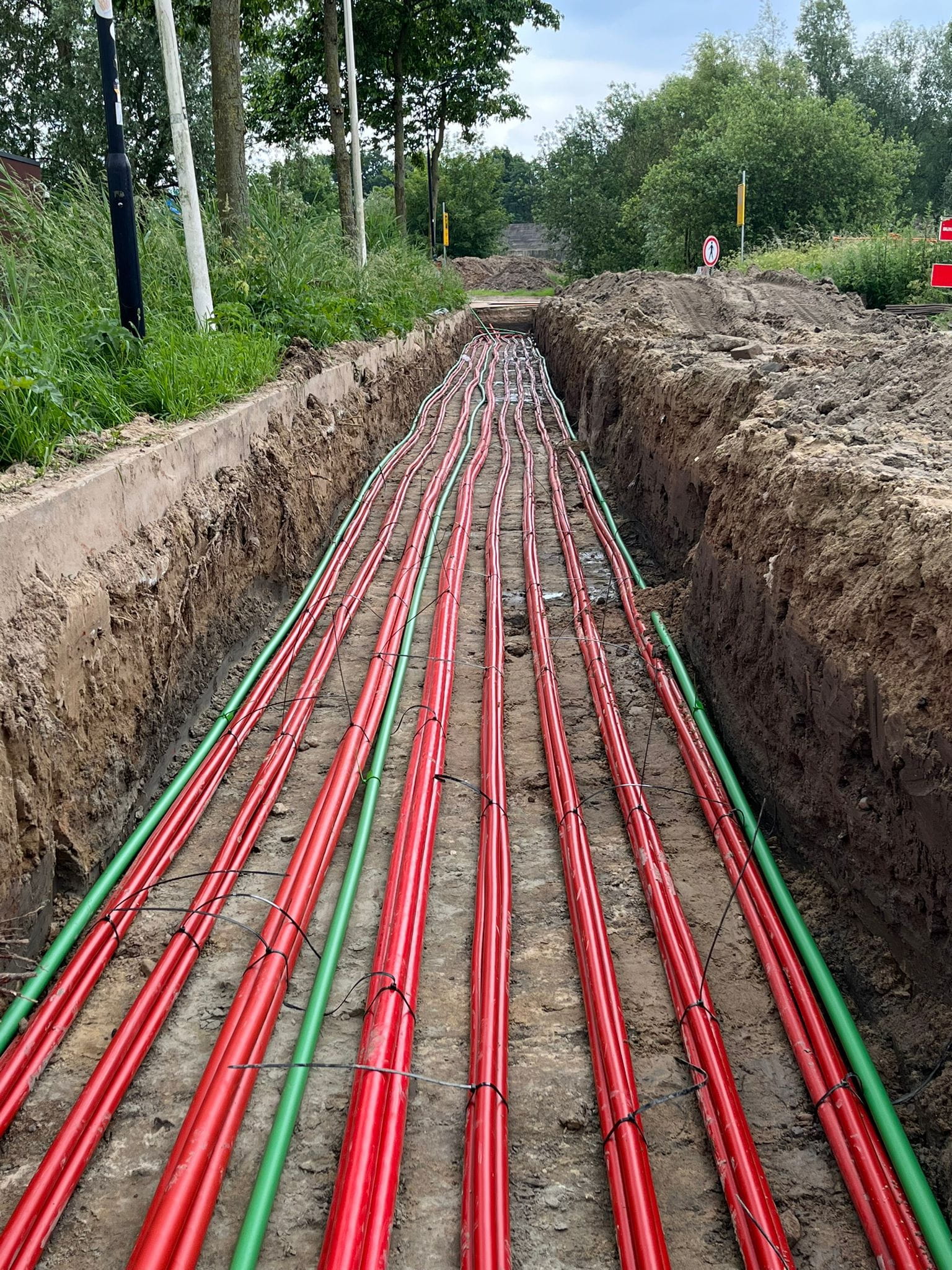 - Open ontgraving: Bij een open ontgraving graven we met een kraan een sleuf. Daarin leggen we de kabels en vervolgens vullen we de sleuf weer op.