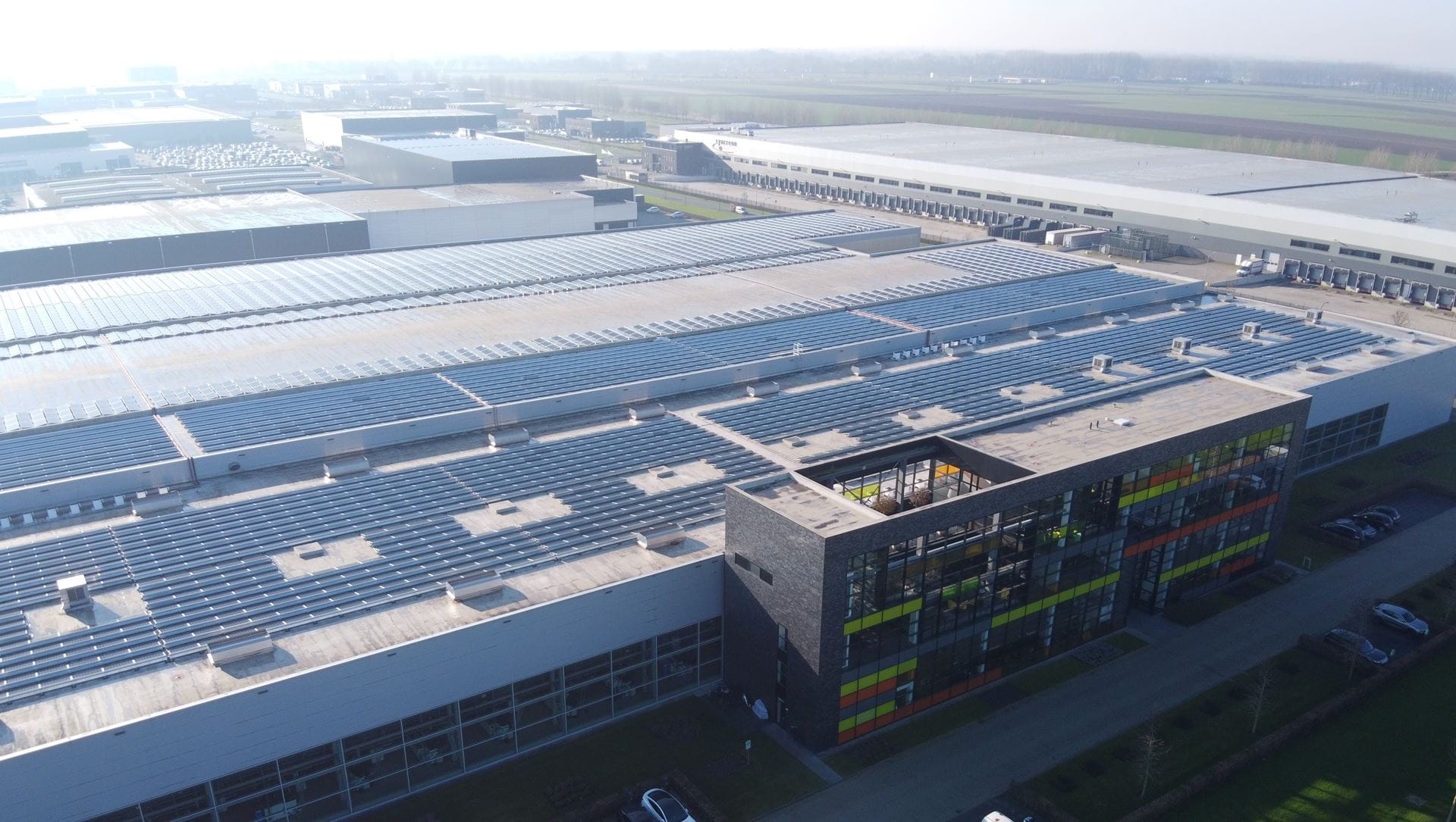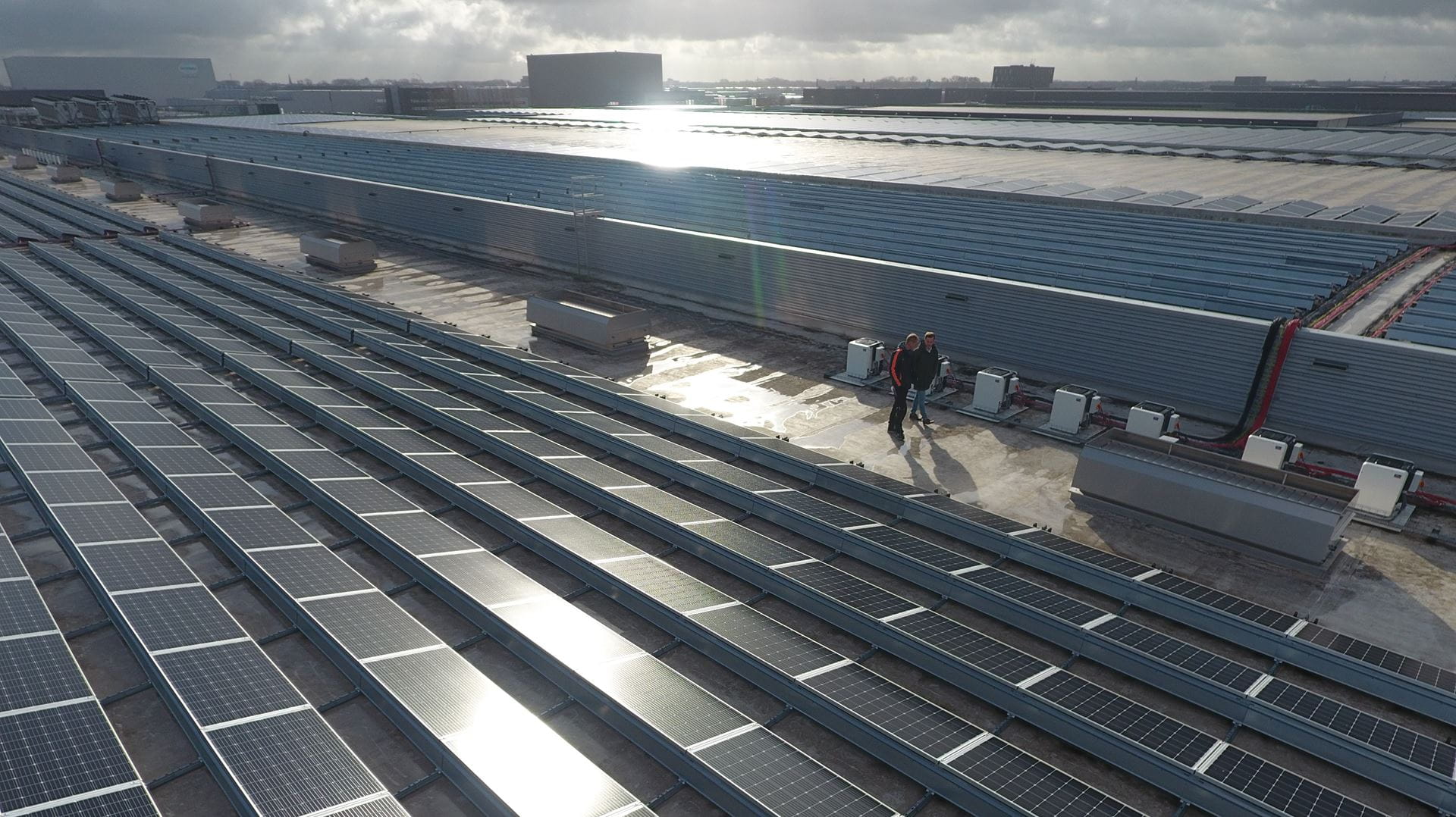 “We hebben bijna 7000 zonnepanelen op het dak. Als de zon vol schijnt, levert dat ongeveer 2 megawatt per uur op. Dat is best veel, want ons verbruik is 3 megawatt. Als het mooi weer is, kunnen we dus twee derde van onze energie duurzaam opwekken. Maar de zon schijnt natuurlijk niet altijd, en zeker niet ’s avonds en ’s nachts. Toch hebben we wel altijd stroom nodig, want we draaien zeven dagen per week, 24 uur per dag. Daarom kijken we ook naar accu’s.”