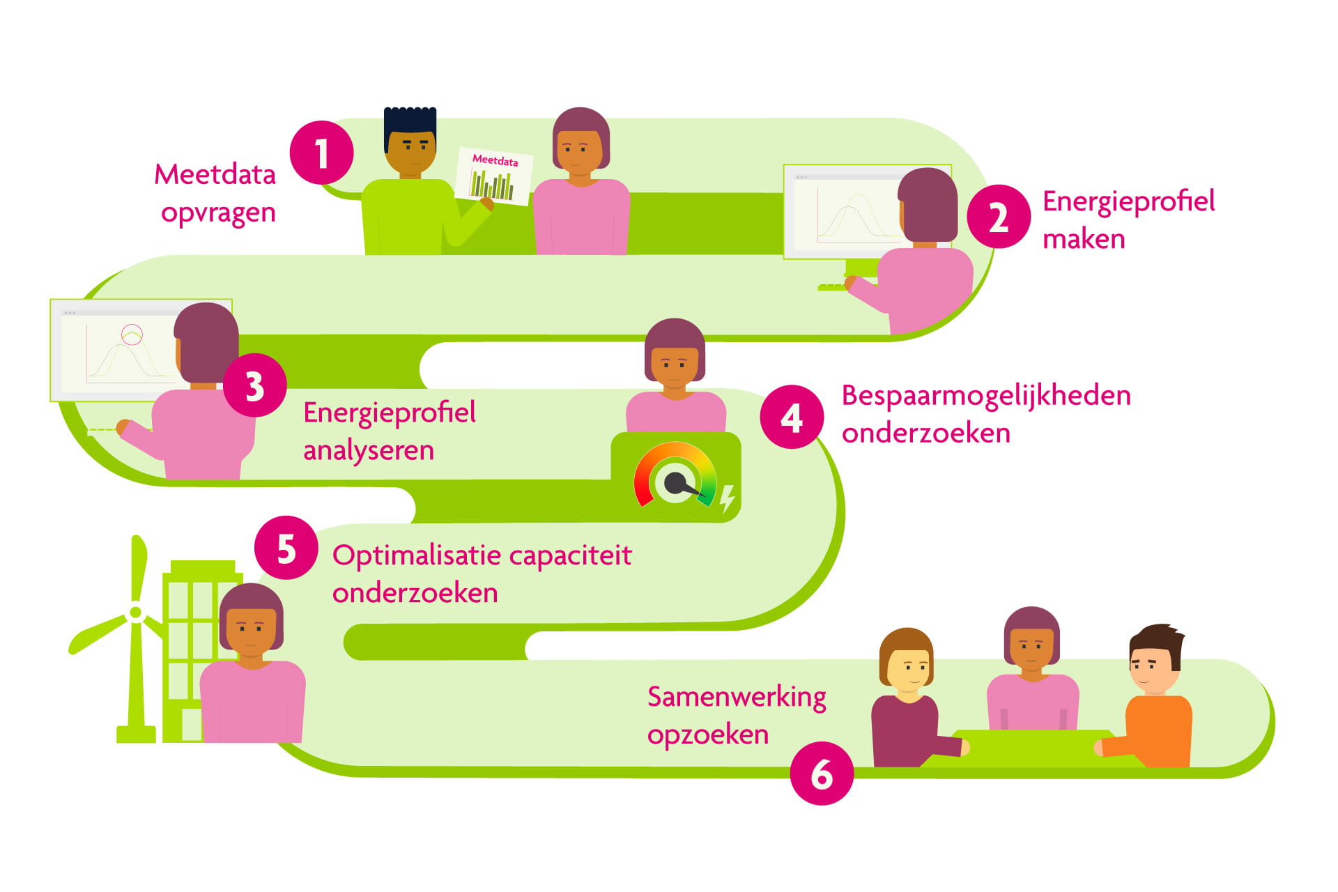 Met ons stappenplan doorloopt u 6 concrete stappen. Het begint met inzicht in uw huidige energiegebruik. Dit vormt de basis om te kijken welke mogelijkheden u heeft om toch in uw energiebehoefte te voorzien, ondanks het volle stroomnet. Daarna nemen we u mee in verschillende oplossingen die u zelf in uw bedrijf kunt doorvoeren én die u in samenwerking met andere bedrijven kunt oppakken. Houd er rekening mee dat de mogelijkheden voor ieder bedrijf anders zijn. Deze hangen af van de lokale situatie.
